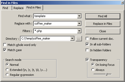 coffee_maker in our example). To accomplish this it's advisable to use an editor that can replace a string in various files at once; both tools that are capable to loop through all files within a particular folder (see