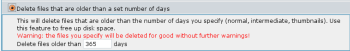 Detta kommer att radera filer som är äldre än det antal dagar som du specificerar (miniatyr- medelstora- och fullstora bilder). Använd den här funktionen för att friställa diskutrymme. Varning: de filer du specificerar kommer att raderas permanent utan några fler varningar!