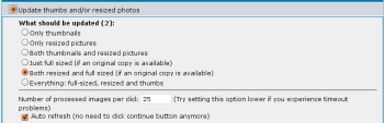 Det här alternativet har bara betydelse om du från början satte resolutionen för den medelstora bilden olikt mot originalbilden, och att du aktiverade skapanden av den medelstora bilden. Om du senare ändrade dig och bestämde dig för att inte behålla det fullstora originalet så kan du använda den här funktionen för söka igenom dina filer och radera alla original på en gång.